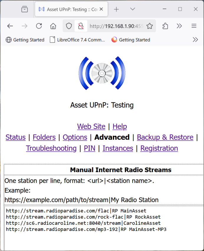 The attached shows "Manual Internet Radio Streams" ... The last in the list (MP3) streams as expected (using BubbleUPNP among others) ... The first two in the list (FLAC) do not stream ... Is there a setting that I have missed? Thanks for your help.