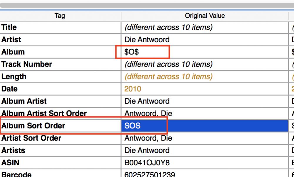 I explicitely added an ALBUMSORT tag with "SOS" as value, hoping that would have the album show up under "[S]" - but it still shows up at the top.