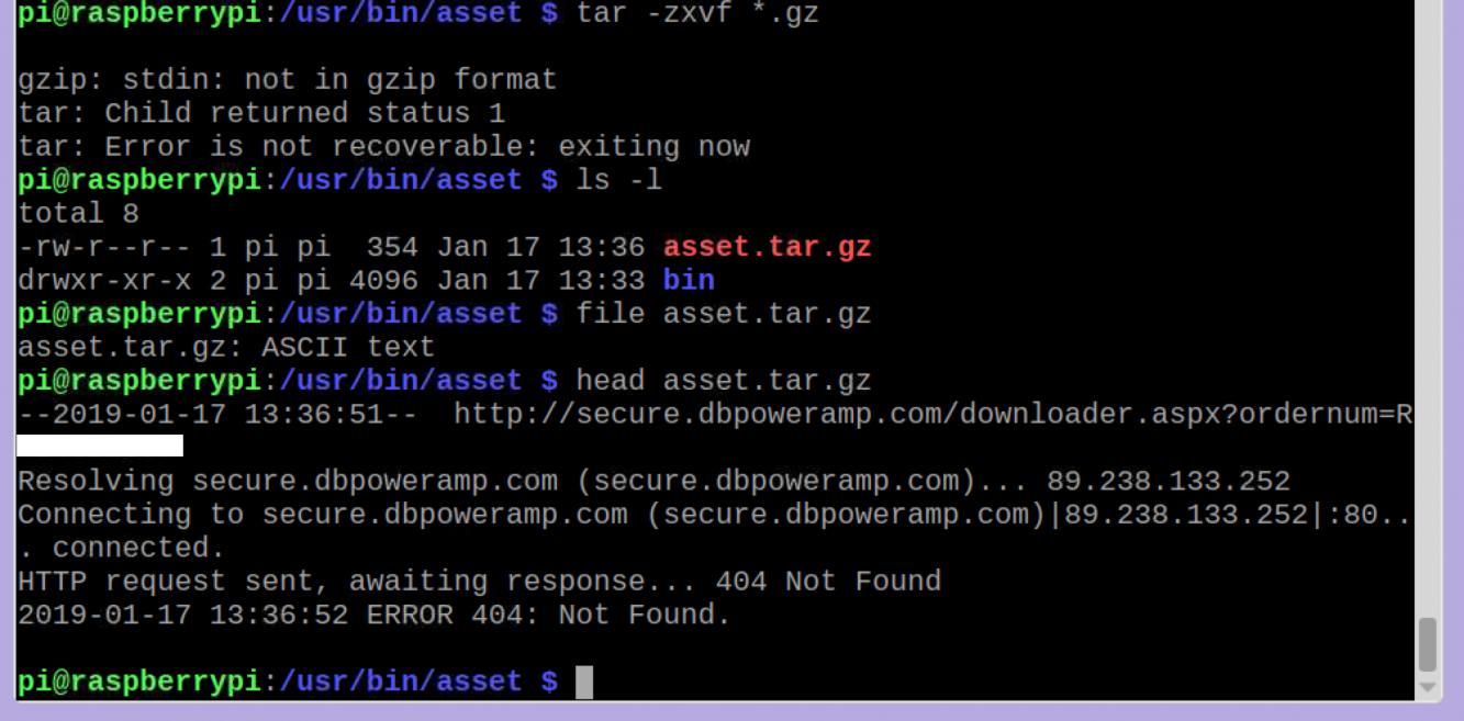 I purchased the Raspberry Pi Asset UPnP and followed the directions to download and install the file on my RaspberryPi Model 3 B+. The download doesn't download the asset.tar.gz binary file. Instead it downloads a file called asset.tar.gz which is a text file and in the text it says that there was a 404 ERROR Not Found. It appears that the URL to download the file doesn't exist (I think).