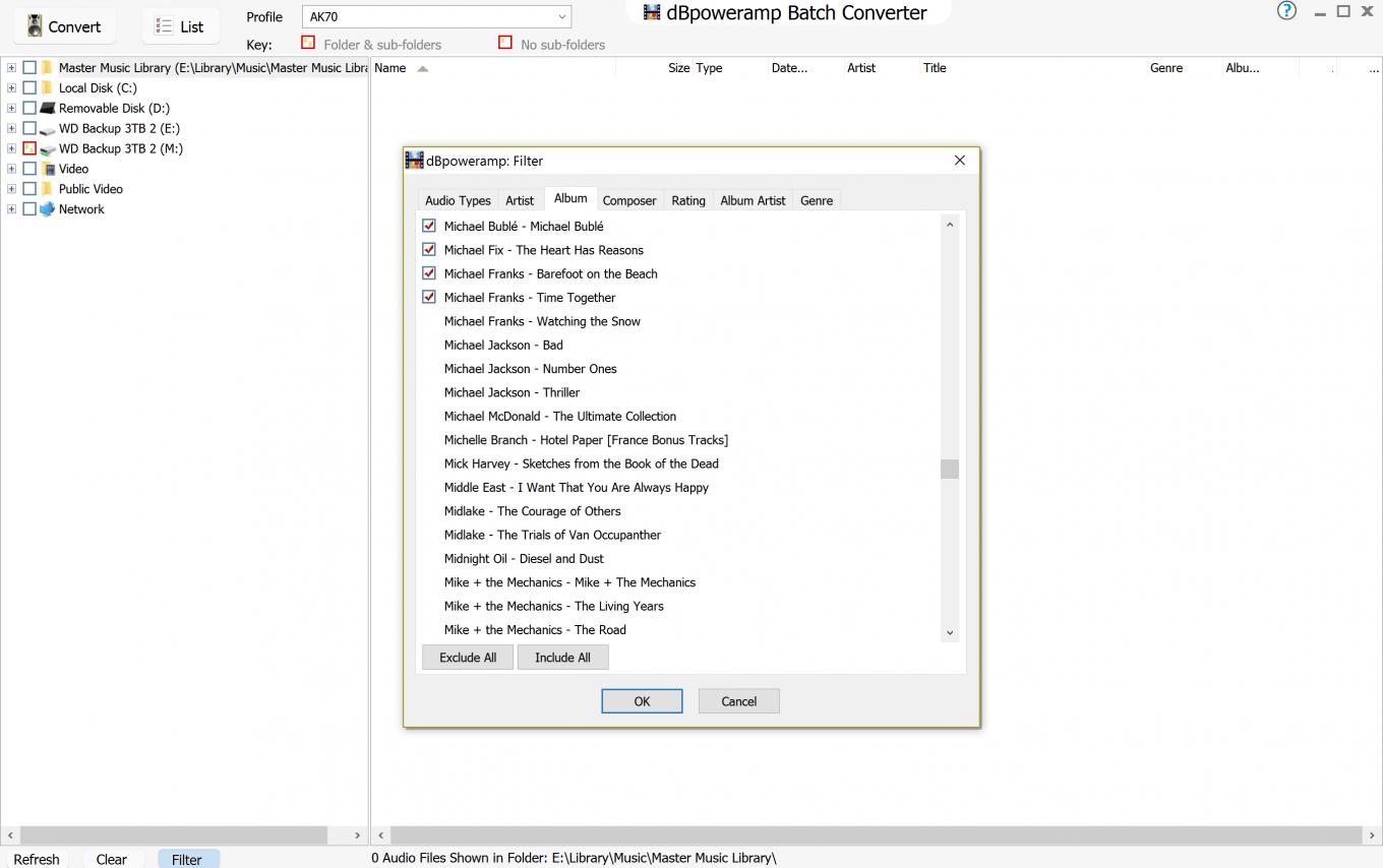 In choosing albums to convert, the files past a certain point ("M") have no check boxes.