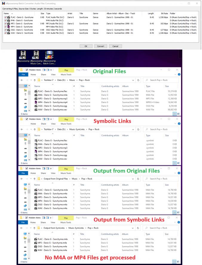 Any ideas? I'm hoping that it may just be a simple Windows Registry edit, or perhaps there is some way to force the Batch Processor to always try to process the m4a and mp4 files from SymLinks. The fact that the standard dBpoweramp Music Converter can process them with no trouble is a puzzle, but shows that it should work with the Batch Processor as well.