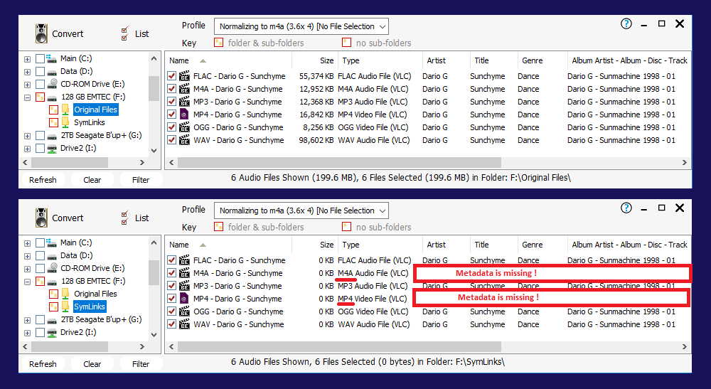However, if I try to batch convert the same SymLinked files, the Batch Converter seems to just bypass the m4a and mp4 files, with no error messages given. It appears that the metadata is not getting through to the Batch Converter for these file-types only, whereas all the other file-types appear, (with their corresponding metadata) and convert normally. What is so special about m4a files and mp4 files (that also usually contain aac encoded audio)?