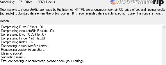 It says "Submitting: 919 Discs 8281 Tracks", I press [Submit Now] and after a while it fails with "Error connecting to accuaraterip (sic), please check your settings."