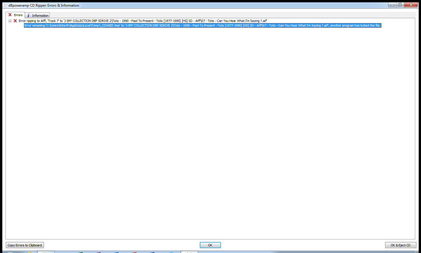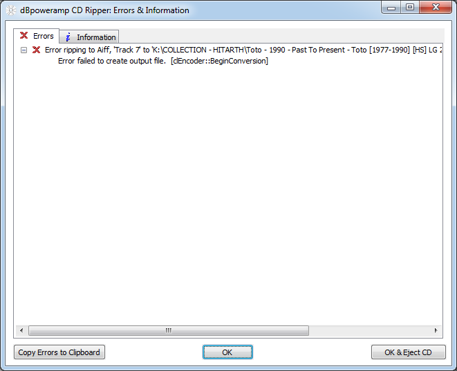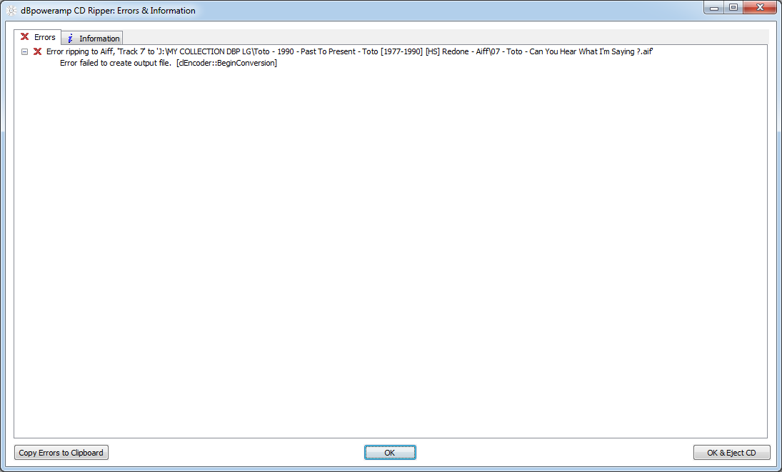 I tried that too .. and I get an "error" on that track .. Track no. 7 on this CD ... on any drive I try to save it, it gives me an eror saying it cannot write that file on that location.