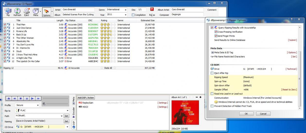 I encountered a strange problem where the last two tracks of a certain music CD (Deleted Scenes From the Cutting Room Floor/Caro Emerald) will not be ripped without errors in dBpoweramp.