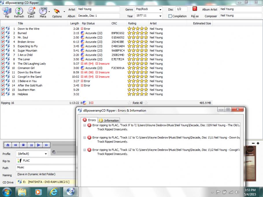 As a non-tech newbie, I have successfully ripped about a dozen CD's with no track errors, solving minor problems along the way. But today while ripping two older cd's I got track errors on both. I read the available Forum text in set-up but I'm not sure I got everything right. I am ripping from a newer laptop onto "My Music." in Windows -- then on to a WD MYCLOUD NAS drive. The messages I am getting are: