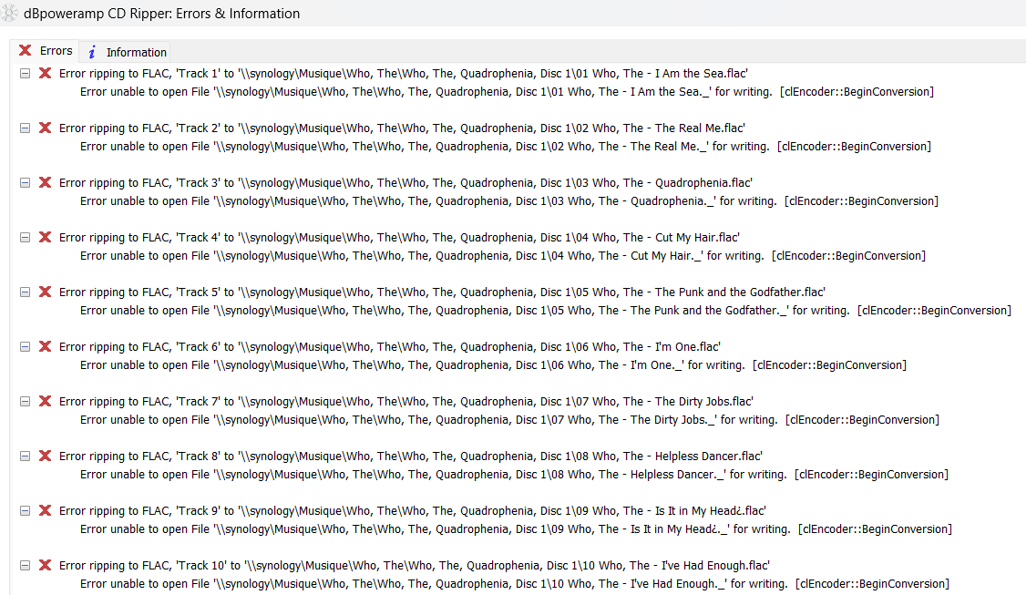 error message seems like dbpoweramp is not getting permission to write files to your NAS. I suspect if you rip CD to your local drive on computer, you won't get those errors. Then you could copy the ripped files to your NAS. Or figure out what you need to do to give permission to dbpa.