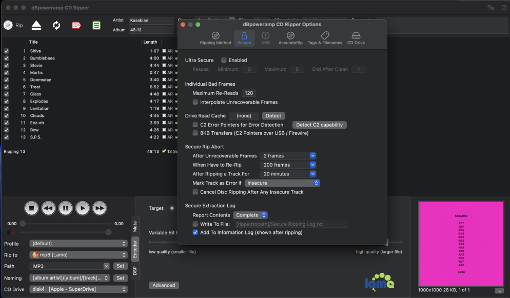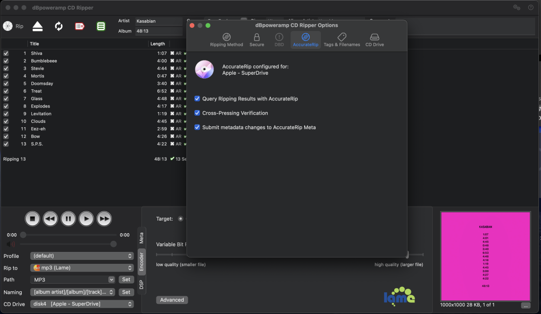Good morning rippers! PLEASE I could really use some help here! I have tried everything I can think of, including using an AI assistant to trouble shoot. I have deactivated my firewall, made sure that dB is allowed in both the antivirus and Firewall settings to connect to the internet. I have installed the newest version of dB. Checked and rechecked the settings. And no matter what I do, accurate rip will not activate. The CD drive is configured with accurate rip. Accurate rip is enabled. The metadata is retrieved for all albums, but each one says not in accurate rip so I have to rip every track on every disc multiple times. I have switched Ultra Secure off, because it means another pass or 2 depending on settings which takes 4 times as long, so it is now set to Accurate rip only with 2 passes. It is double the time firstly, and secondly I don't REALLY know if the rip is ACCURATE which is the main point of having dB. The strange thing is I had one disc with one track that was a problem, so to try to get around it I switched to BURST. When I did that the track displayed 'Not in accurate rip". The burst didn't help, the track is corrupted and the rip result is worth deleting. But out of 15 discs yesterday until 2am, every one was "not in accurate rip". I have ripped 1000's of discs already with my drive and the same laptop and same internet connection, only real difference really is the recent Sequoia update from Mac. And indeed the meta data does work. I had one local disc yesterday that the metadata didn't pick up, so I got the Discogs URL for it and manually pasted it in and it was all there. Tomorrow I have 50 discs arriving, and would like to ensure that Accurate rip is working before I rip them to library. As we all know, ripping takes a lot of time, if you do not have accurate rip to get by with one pass it takes so much longer, who knows if it is really accurate, and if there are problem discs that need re-ripping of frames it is painful. Please see screen shots attached, and PLEASE someone help!