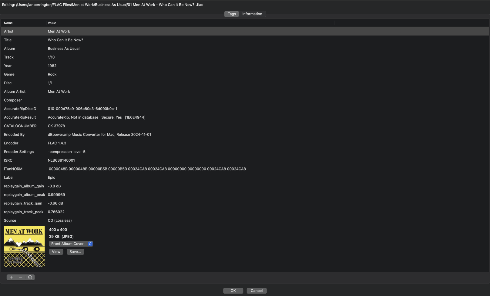 Thank you, happy to do so. Sorry for my ignorance but where do I find it in my files? I have set the ripping program to display results but not to save to the album file. Otherwise, i can re-rip it (overwrite) and post those results. Attached is a screenshot of the Perfect Tunes Tags on that rip. Probably the wrong one that you need. Please explain where I can find the file you need. Thank you.