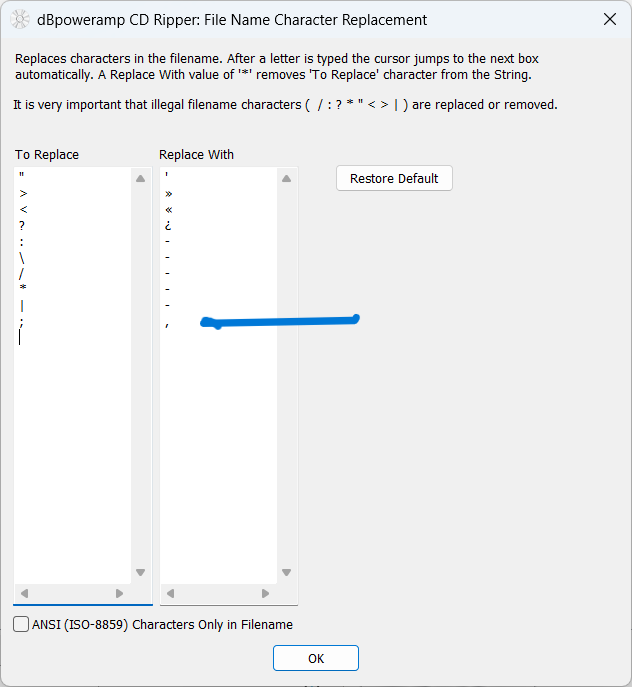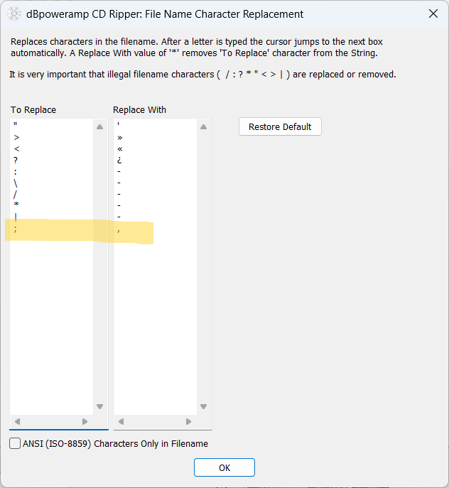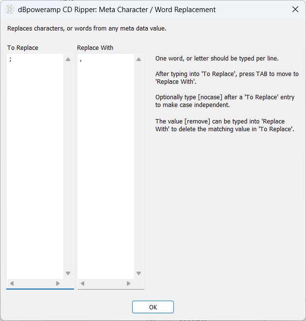 i have some CDs where there are multiple artists, seperated by a ";" i have made the addition for it to replace by "'," in the "tags & filenames" section. unfortunately, the change does not take place & only the 1st artist name is shown after the rip.