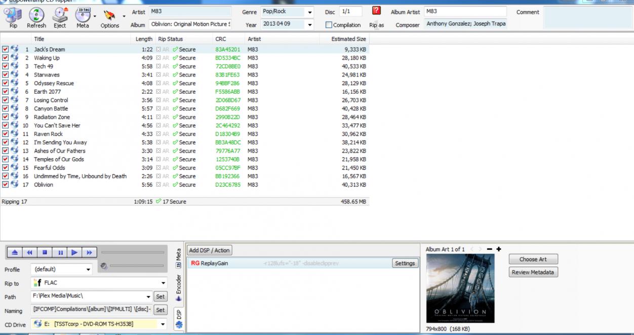 Information ripping to FLAC, 'Track 1' to 'F:\Plex Media\Music\M83\Oblivion; Original Motion Picture Soundtrack\01 - Jack's Dream.flac'