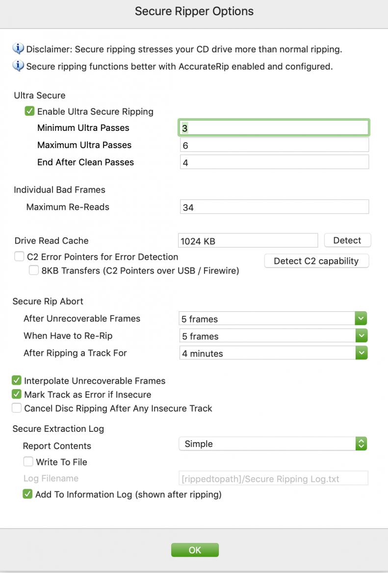 My primary goal is to achieve bit by bit perfect rip and time taken is low priority. Error correction is OK as long as my primary goal is met i.e. interpolation/approximated correction is a big no. I want to also make sure PureRead and setting on dBmpower Ripping Method options don't conflict.