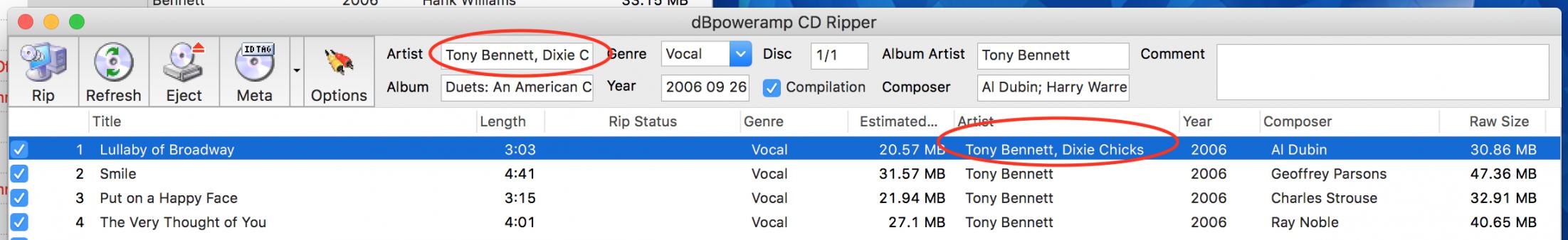 Using CD Ripper 15.8 for Mac (same result in 16b10). I have albums that find multiple Artists, Composers, etc as I look in the Metadata panel. The left side of that inspection panel for the album shows artists like "Tony Bennett; Dixie Chicks" for each track. Great. Multiple artists or composers show correctly at the top of the CD Ripper album panel as I scroll down in the track listing, but corresponding multiple artists do not show in the Artists column on that same panel as it should -- only the first artist prior to the semicolon. When the CD is actually Ripped, only the first artist is placed into the metadata. If I manually change the semicolon to a comma before Ripping, all is well, e.g. "Tony Bennett, Dixie Chicks" both displays correctly in the Artist column and appears in the metadata.
