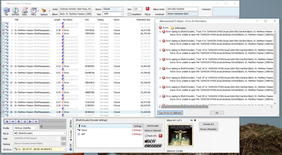 Error ripping to [Multi Encoder], 'Track 16' to '\\WNOOK-SYNOL\music\John Eliot Gardiner\Bach; St. Matthew Passion [1988 Recording]\16 Andreas Schmidt - St. Matthew Passion (Matthäuspassion), for soloists, double chorus & double orchestra, BWV 244 (BC D3b); Part One; 'Petrus aber antwortete und sprac.IGNORE'