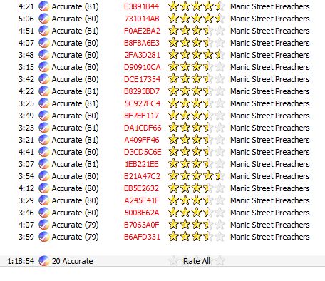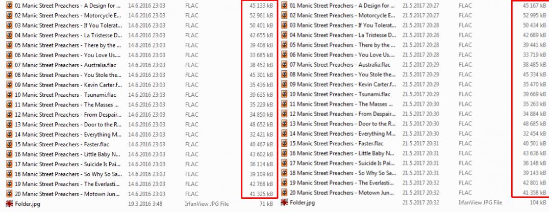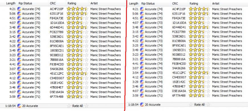 I have 2 CDs of Manic Street Preachers' Greatest Hits, which look identical, but one came in a jewel box and one in a paper box. The front of the CDs themselves is the same, but both have different codes in the center. When I ripped them, the Ripper reported the same Rip Status and CRC for both of them. The individual file sizes slightly differ, however. I assumed that different pressings would have different numbers in the "Accurate (xx)" Rip Status and different CRC. Or can these 2 CDs be considered the same?