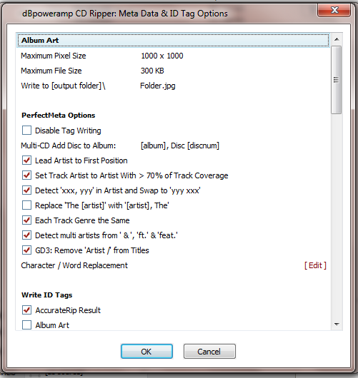 In garym's note 5, he also mentioned that he doesn't embed art in each track, but uses a cover.jpg. This attachment shows using Folder.jpg, which I use, and also the Album Art, pixel and file size restrictions, I've set. This prevents the occasional massive file size, and helps maintain compatibility with some players: I believe that Bluesound rejects file sizes bigger than 600kb, so the 1000x1000, 300x300 settings should be OK.