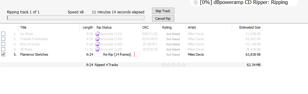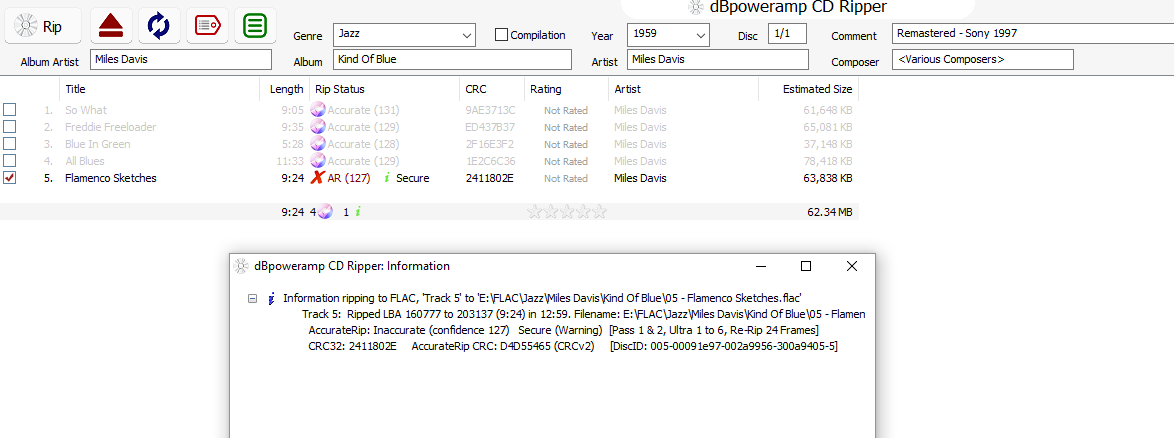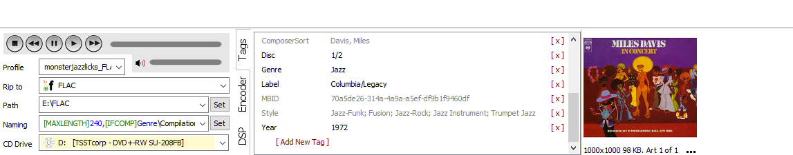 Secondly, usually, when I have ripped a CD and, for whatever reason, re-insert the CD (eg. at a later date) and open up dBpa, the s/w REMEMBERS all of the tagging, composers, dates, comments, etc, exactly as I had edited them during the most recent rip. This is true for all CDs ripped to date, including disc-2 of: 'Miles Davis Live At The Philharmonic'. However, strangely, for some reason the s/w refuses to remember the data for disc-1 of this double-CD?!: