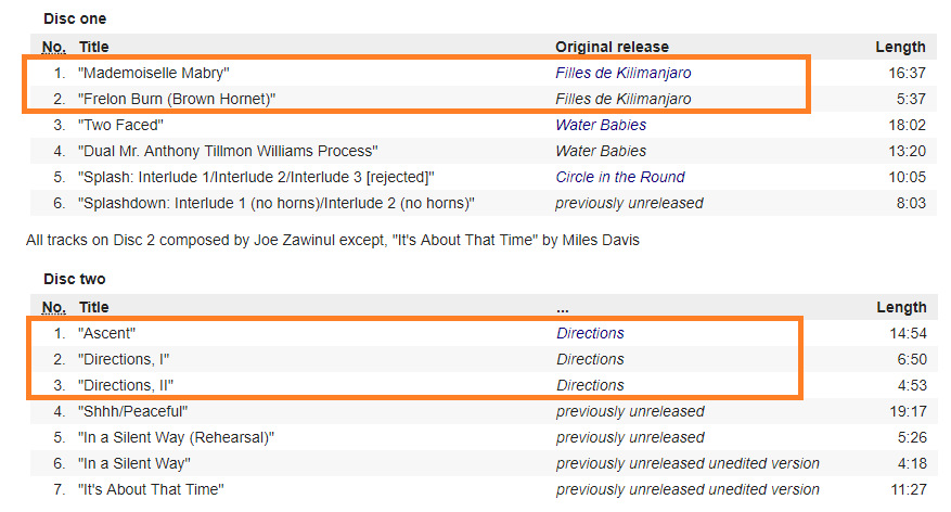 If I am correct, then that is all well and good. However - for me - what throws a spanner in the works is that on: "The Complete In A Silent Way Sessions", it includes material of which appears on different albums, both of different release dates! For example, two tracks ('Mademoiselle Mabry' and 'Frelon Burn') are from: "Filles De Kilimanjaro" - which was released (as an album in it's own right) in 1968. Similarly, tracks 'Ascent' and 'Directions' were released in 1981 on: "Directions" (again, as an album in it's own right):