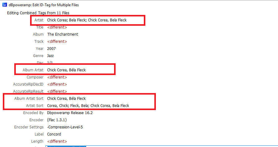 this results in 3 artists showing up in the tags, which is good for searching and indexing, etc. But the ALBUM is only on your harddrive ONCE, and it is located in the folder "Chick Corea & Bela Fleck"