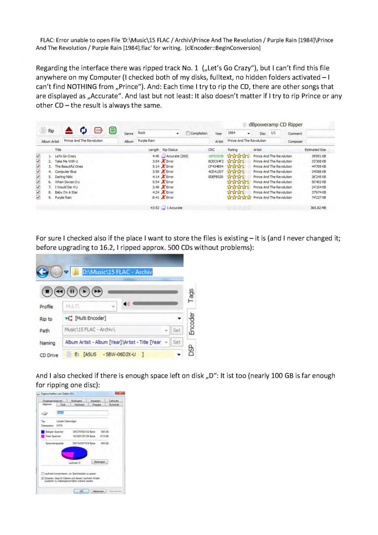 After registration retrieval I was able to download Version R16.2 (for free) – which I did. I installed the downloaded version (after using dbPoweramp for years in several older versions, more or less without problems) and since then, I’m no longer able to rip CDs – no idea why. Can someone help me? More detailed information are in the attached JPG-Files (one JPG for each site of the original PDF documentation).