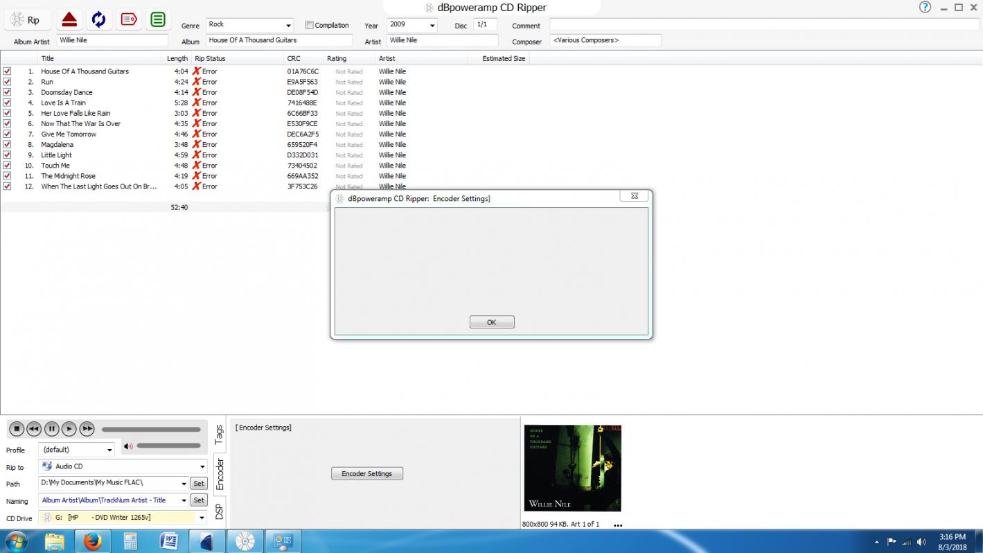 Error ripping to Audio CD, 'Track 1' to 'D:\My Documents\My Music FLAC\Willie Nile\House Of A Thousand Guitars\01 Willie Nile - House Of A Thousand Guitars'