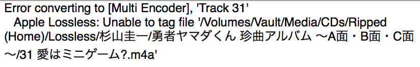 I've found that when ripping CDs with Japanese track names, if the track name contains a ? (question mark) character, the output file will encode with an error. (It seems to be when trying to add tags/artwork.)
