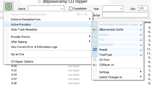 I found a couple of huge boxes of CDs I hadn't ripped (easily 1000cds) and have about 100 left. Suddenly, this morning, after closing CD Ripper and restarting it a few minutes later, CD Ripper returns no meta data for any cds. I've restarted the computer and the program and this issue persists. There are CDs in these boxes that I ripped years ago on another machine without having to input any titles or anything myself that return nothing. Several other major label release CDs return nothing. Since the restart CD after CD has come up with no meta data but still says they're "in AccurateRip." When I click on the menu "Review PerfectMeta Matches" is grayed out. Under active providers PerfectMeta is grayed out as are several others.