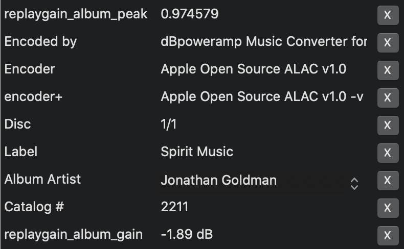 ReplayGain DSP is set (within the main Ripper window with Multi Encoder for aiff and alac) to use Track & Album Gain when ripping, but only the replaygain_album_peak and replaygain_album_gain tags are written in the resulting files (both file types have the same tags). When I convert the ripped files (untouched since the rip) with the ReplayGain DSP (and the other DSPs as set when ripping) set exactly the same, the replaygain_track_gain and replaygain_album_gain tags appear, but mirror the album_peak and album_gain tags(?).