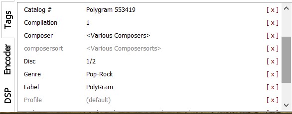 A few more questions regarding the tags section of the CD ripper. When a field shows a value inserted between two < > style brackets (e.g. <Various Artists>), am I right in thinking that these arrows show the field has more than one value, and that those values will be inserted automatically? For example, a compilation album by various artists or where tracks are composed by different composers.