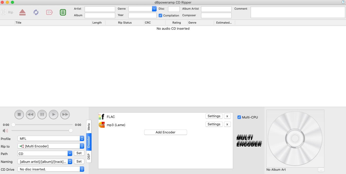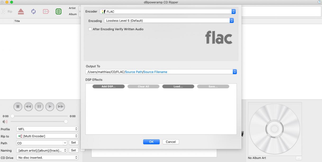 The CD is ripped into /Users/myhome/Album/title.flac resp /Users/myhome/Album/title.mp3