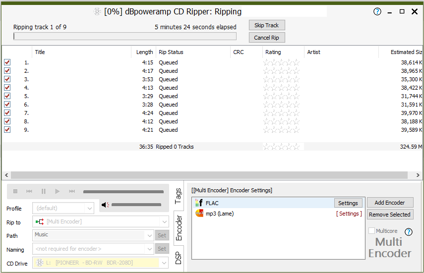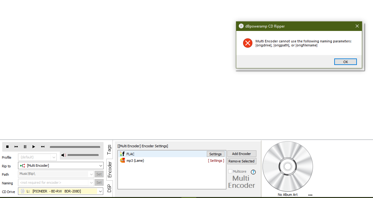 I cleared the HKCU keys. If I select just FLAC for example, ripping works. But multi-encoder does not work.