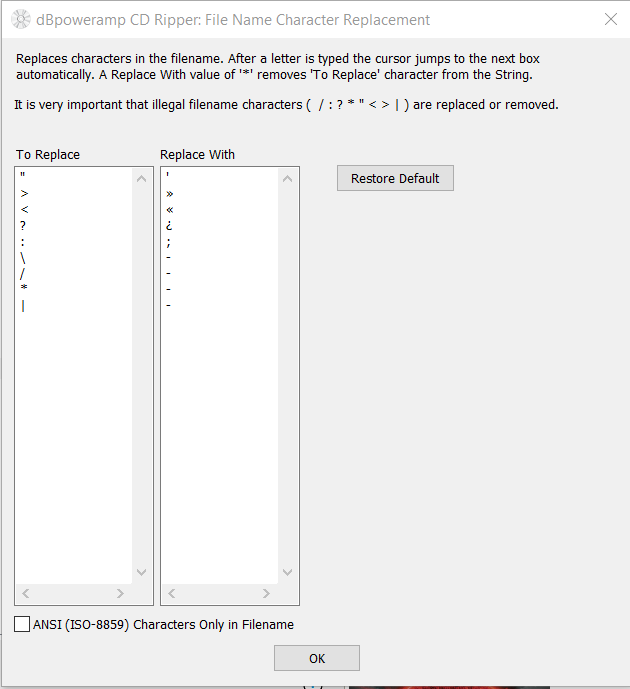 And lastly, not really a bug, but more of a filesystem/character problem... as default you have the ? character being replaced by the inverted interrogation mark (¿). If a track, like "What's the Frequency, Kenneth?" has a name like this, dBpoweramp will not encode the track because the bogus interrogation mark (a file system issue). All I could workaround this was to replace ? for underscore.