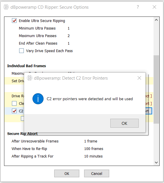 The C2 error correction is also detected, but if I tick this box, the ripping is infinite (drive reads from time to time, lights on and off), spinning very slowly.