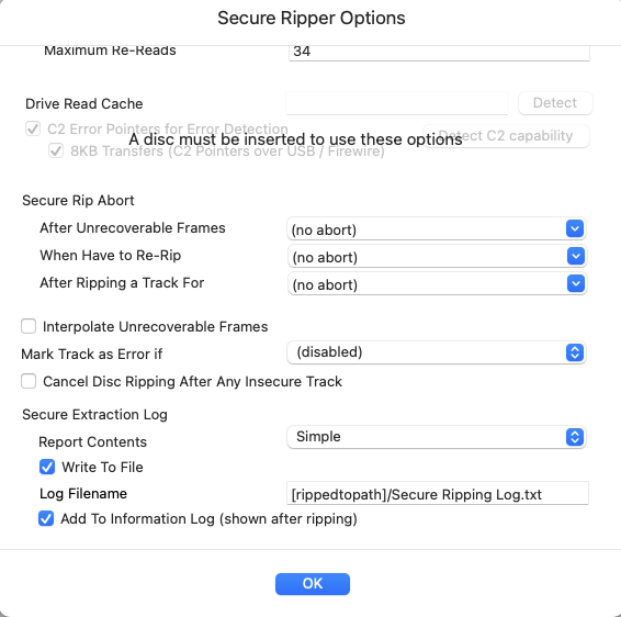 Thank you for this great information! I've been trying to figure-out how to get proper log files saved with my flac files and that detail about performing "secure rip" resolved the issue. Thanks again!