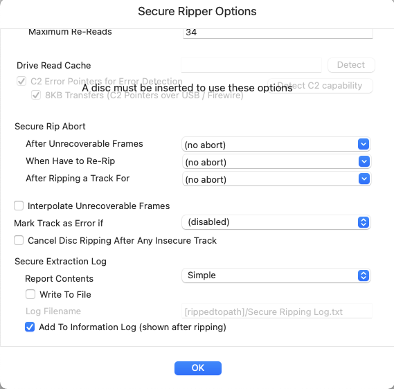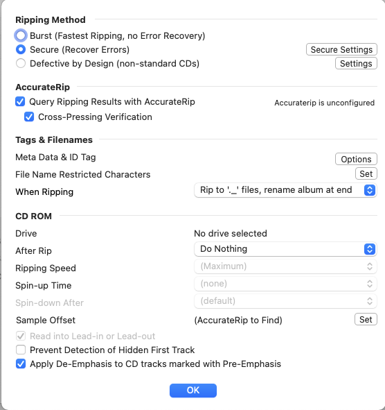 Thank you for this great information! I've been trying to figure-out how to get proper log files saved with my flac files and that detail about performing "secure rip" resolved the issue. Thanks again!Originally posted by simbunDid you see my reply to the thread you started yesterday?