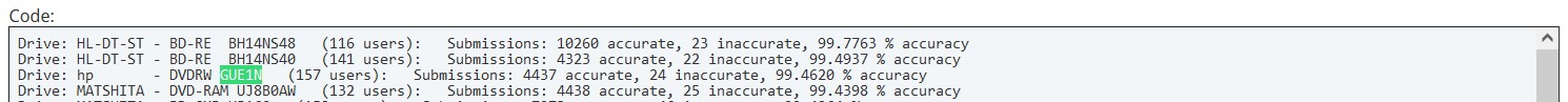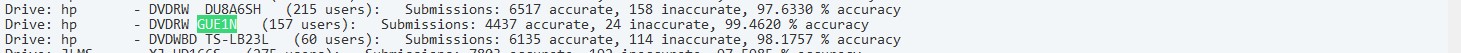 Drive: hp       - DVDRW GUE1N   (157 users):   Submissions: 4437 accurate, 24 inaccurate, 99.4620 % accuracy