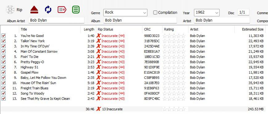 Track 1: AccurateRip Verified Confidence 44, Pressing Offset -29 [ARv2 CRC 1DA13D13] C:\Users\hrlfc\Music\Bob Dylan\1962 - Bob Dylan\01. You're No Good.flac