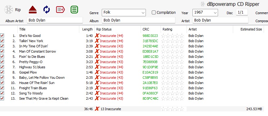 Track 3: AccurateRip Verified Confidence 43, Pressing Offset -29 [ARv2 CRC C9343B69] C:\Users\hrlfc\Music\Bob Dylan\1962 - Bob Dylan\03. In My Time of Dyin'.flac