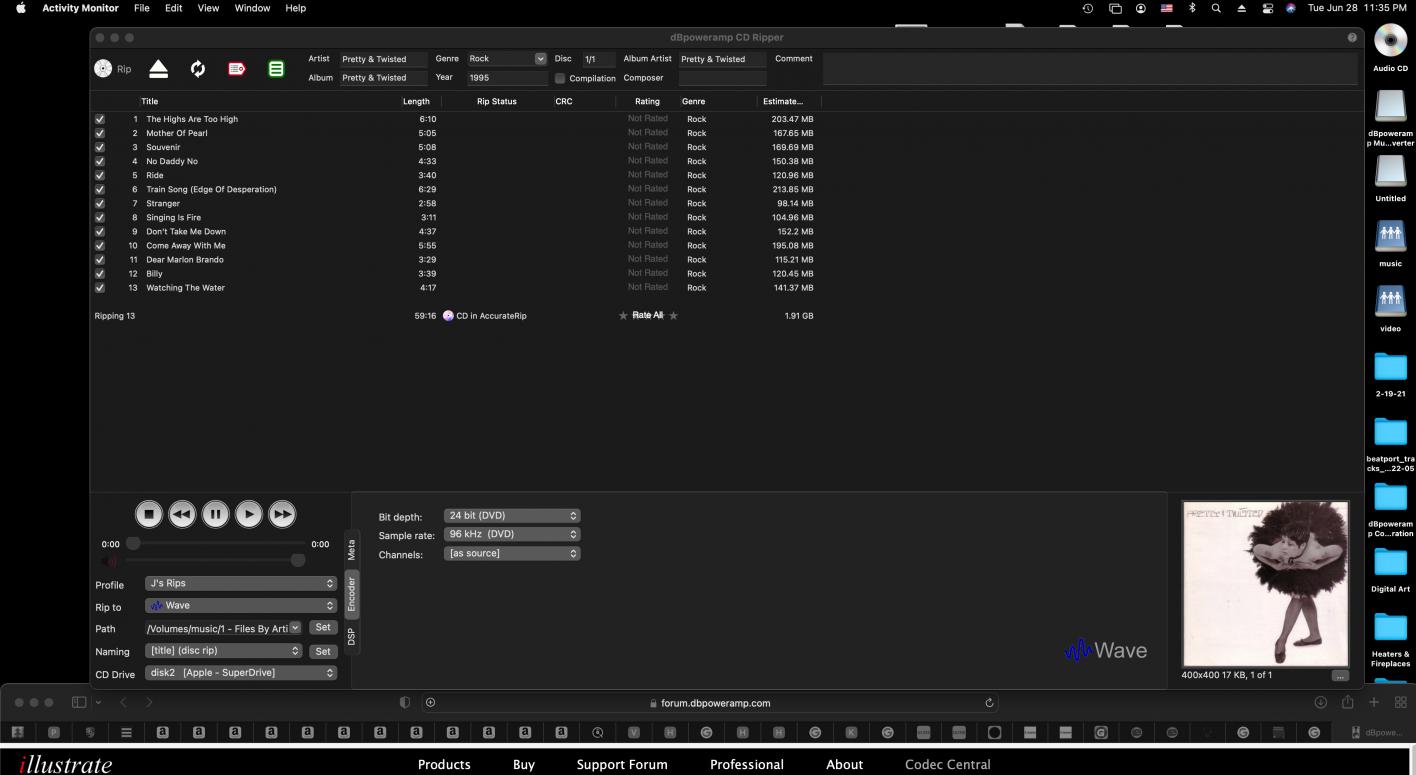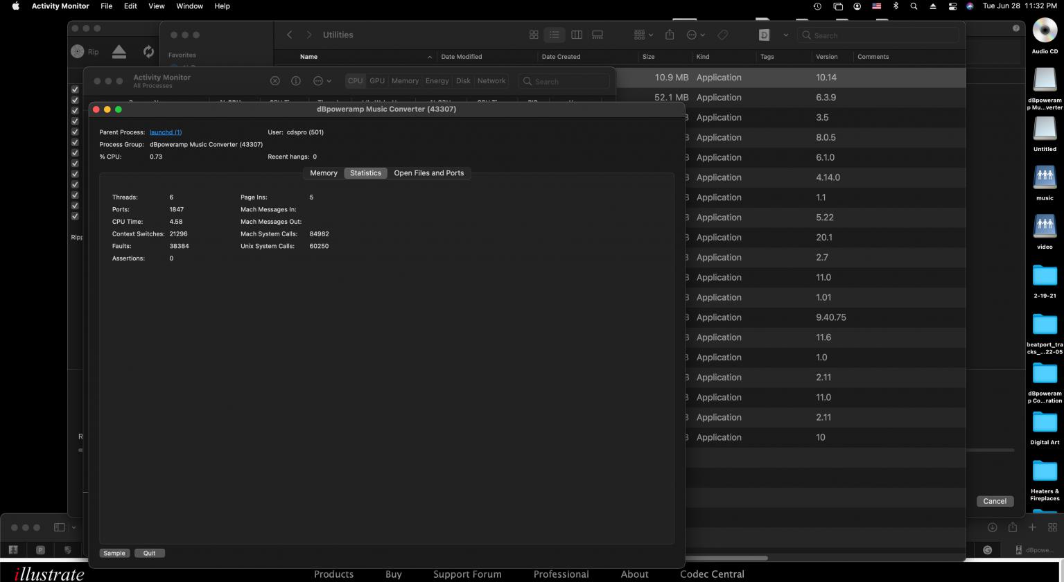 After inserting a disc or opening the DB app and selecting the CD Rip option, the drive reads the disc, the track times populate but no titles or artwork. The app hangs mid-process while retrieving the Intelligent Metadata. It appears to acquire the results from one online source but gets delayed either in between or while retrieving the next metadata batch. Today the app hung for about two hours. App unresponsive, the curved arrow process wheel located in the upper left of the app window spinning but all app buttons and options are faded and unselectable. The blue status bar at the bottom of the app window halfway full. The Force Quit menu didn't indicate the app was unresponsive.I've taken a screenshot while in the hang state and after the track field finally populated.