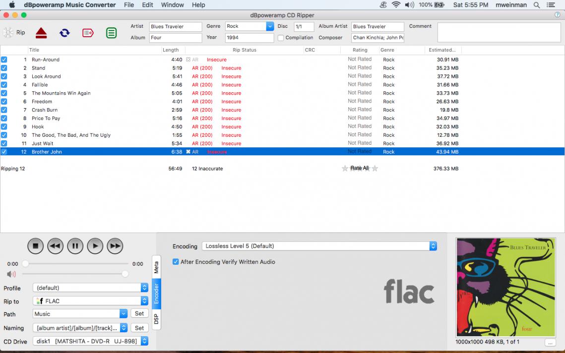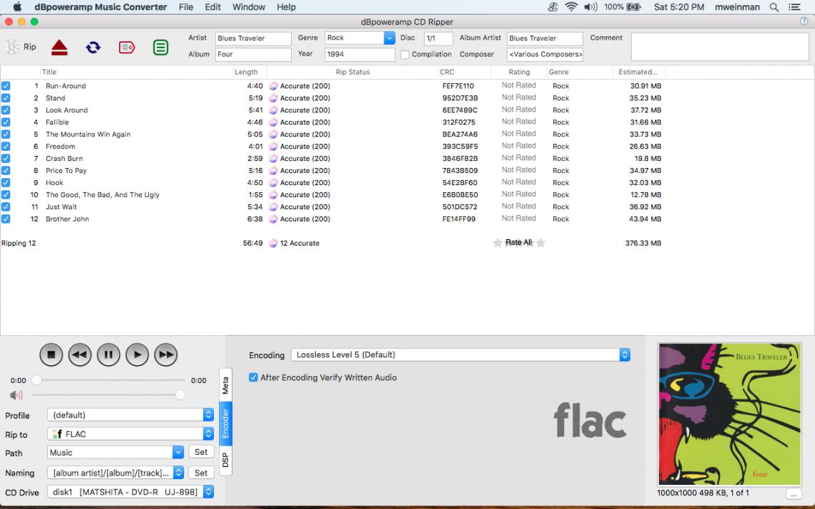 Track 1: Ripped LBA 32 to 21035 (4:40) in 0:51. Filename: /Users/mweinman/Music/Blues Traveler/Four/01 Blues Traveler - Run-Around.flac