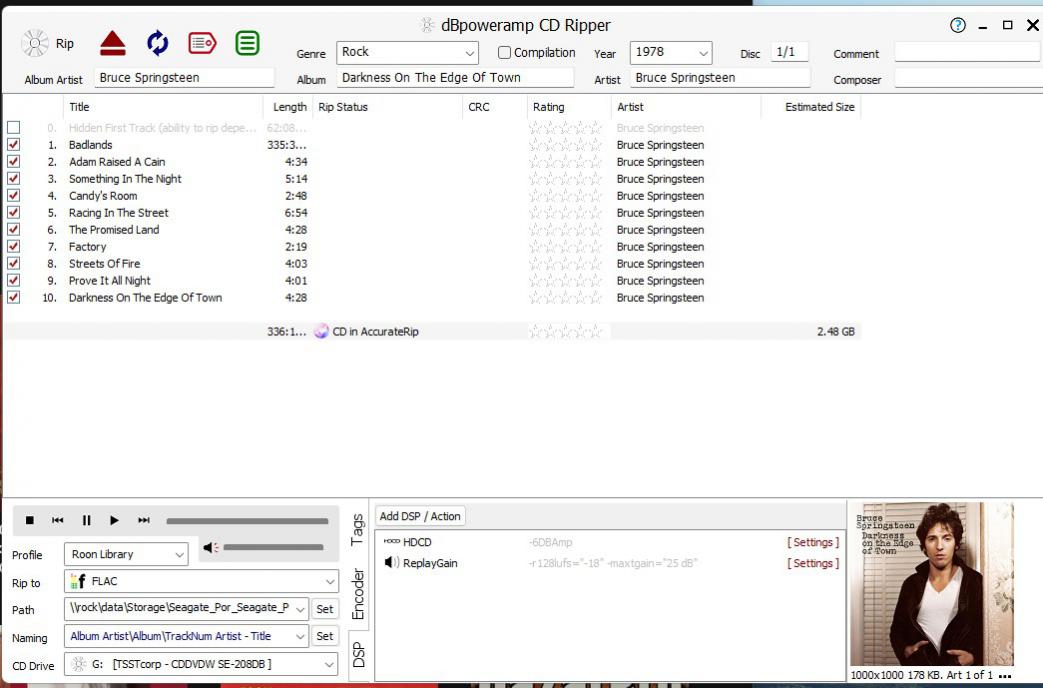 Track 1: ERROR Ripping LBA 16777209 to 18278 (335:36:43) in 0:00. Filename: \\rock\data\Storage\CDs\Bruce Springsteen\Darkness On The Edge Of Town\01 Bruce Springsteen - Badlands.flac