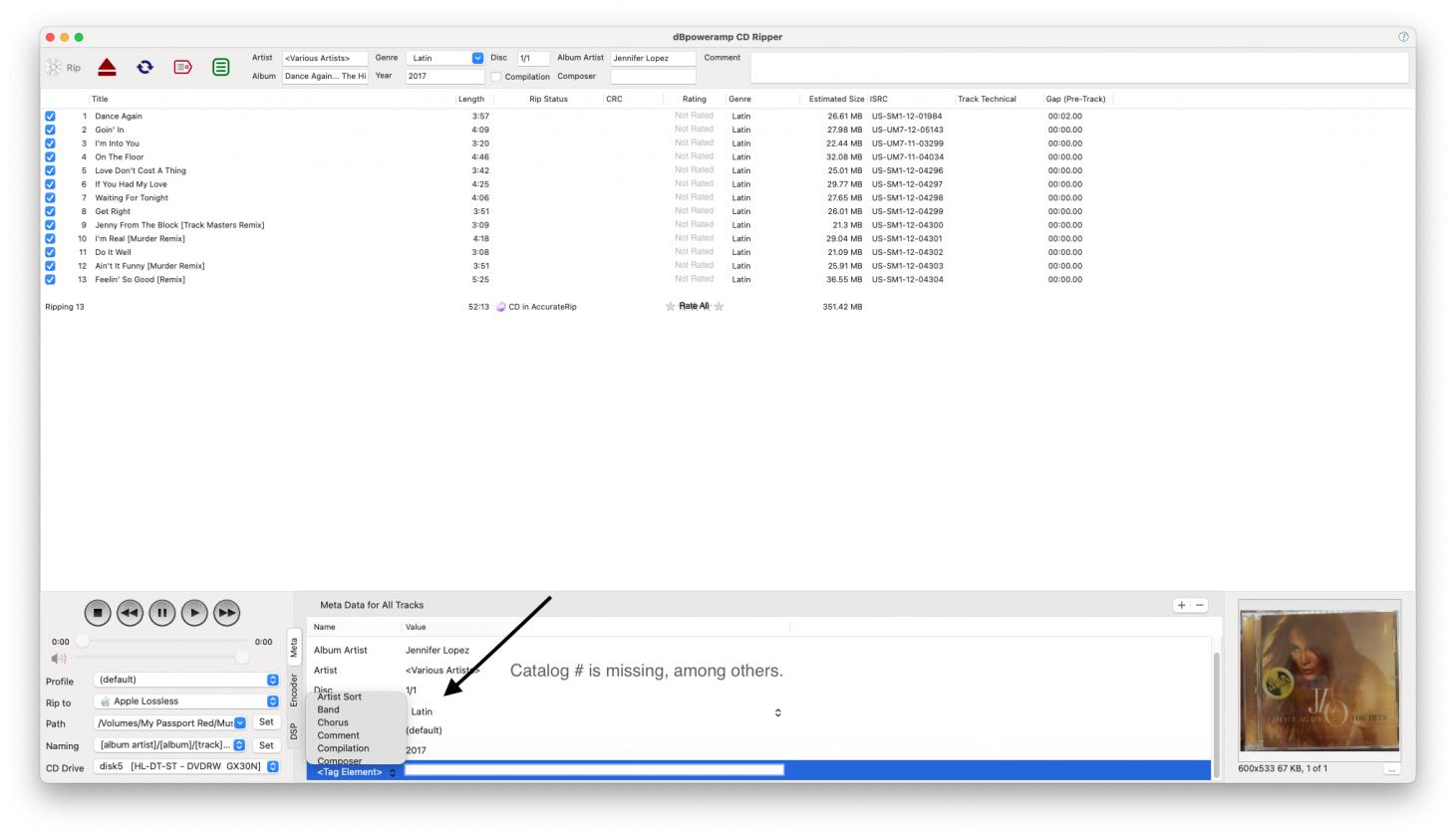 After the latest update to dBpoweramp for OSX (R2023-06-15), some metadata categories are missing from the drop list. I add the following tags to my rips, CatalogNo. and UPC. UPC is there, but Catalog No. is missing. Anyone else got tags missing.