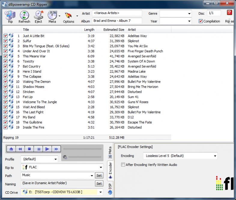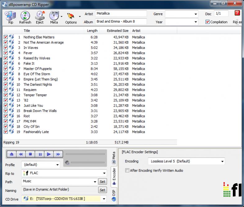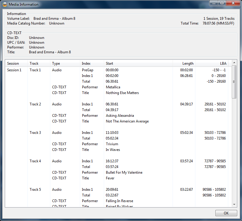 with the PERFOMER line deleted. I burned the CD again and this time dBpoweramp displayed both Title and Artist correctly. This worked fine until Album 8: dBpoweramp shows "Metallica" (who are track 1 and track 7 on this album) as the artist for every song. The same thing happened for Albums 9 and 12, but Albums 10 and 11 worked fine! I've edited every single .CUE file in the exact same way, they all follow the same format, so why is this happening on some albums?