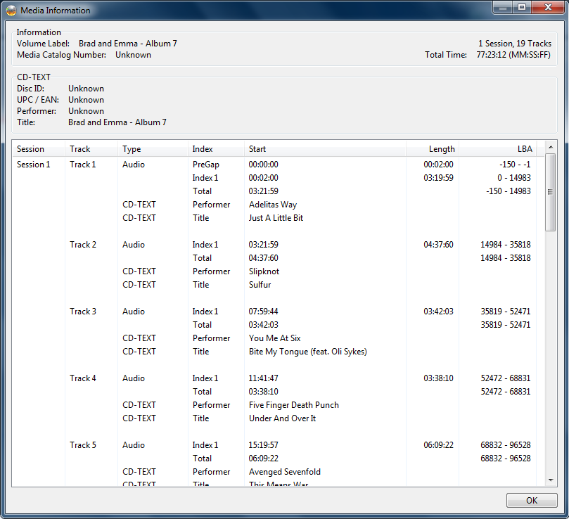 I'm trying to make some compilation albums for a mate. I created a .CUE file in ImgBurn: every track is set to "CD-TEXT: Tag", Default CD-TEXT (Disc / Track) is set as "Tag / Tag". For "Disc", I changed it to "Custom" and put in Performer: "Brad and Emma", Title: "Album 1", then burned the CD. When I opened it in dBpoweramp, the "Title" tag was showing correctly but the "artist" column was blank. I ripped 3 tracks from the album and all of them had wrongly set the artist tag as "Brad and Emma".