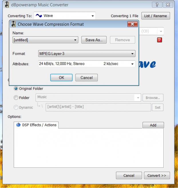 Something isn't right! When I clicked on the Choosewave Compression Format, the choice to choose MPEG layer 3 is not there. Just the PCM which doesn't give me the ability to make small wav files, 24kbgs, 12,000hz at 2kgper sec. That is how I did all my music for years from the purchased dBpoweramp from years ago.