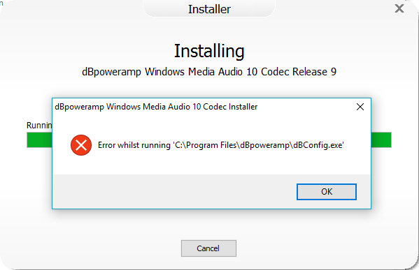 I downloaded dBpoweramp-Codec-WMA10Pro to install the wma codecs to my Win10 PC. It appears to install the .dll's into the 64 bit Program Files folder, while all other codecs are in the 32 bit Program Files (x86) folder. I get the following error after install: