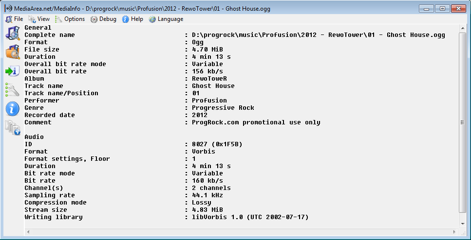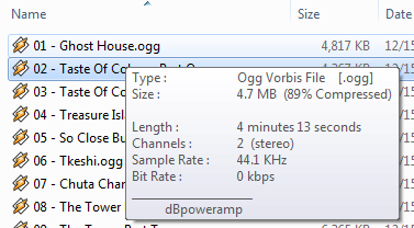 When I mouse-over OGG files, Length, Channels and Sample Rate are correct, but Bit Rate shows us as 0 kbps, and none of the header metadata (Title, Artist, Album, Year, Genre) is shown. I can put the same files in Winamp's playlist and Alt-3 and see all the header and format metadata info.