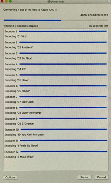 With the batch converter I select a few files for the workflow above to be processed. After some seconds, the progress window shows the first running encodings. And after a few minutes or even seconds, some encoding processes seem to hang at roughly 99%. And the affected encoding processes become more and more, until all processes hang.
