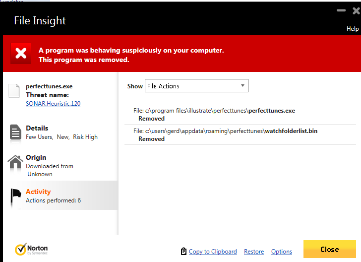 I just purchased PerfectTunes 1.7 and tried to install it on my PC with Windows 7 Pro with latest patches. I have Norton Antivirus running on the PC which indicates that it has removed a virus from PerfectTunes, and as a result Perfect Tunes cannot be started on the PC.