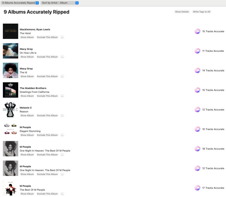 I have noticed that the sorting of Albums differs between apps in PerfectTUNES. Particularly between AccurateRIP and ReplyGain. If an album title starts with The or a single capital letter or even lower case determines the sort. Example "k.d lang", "Kasey Chambers"', "KC and The Sunshine Band", "The Koi Boys" are all handled differently.